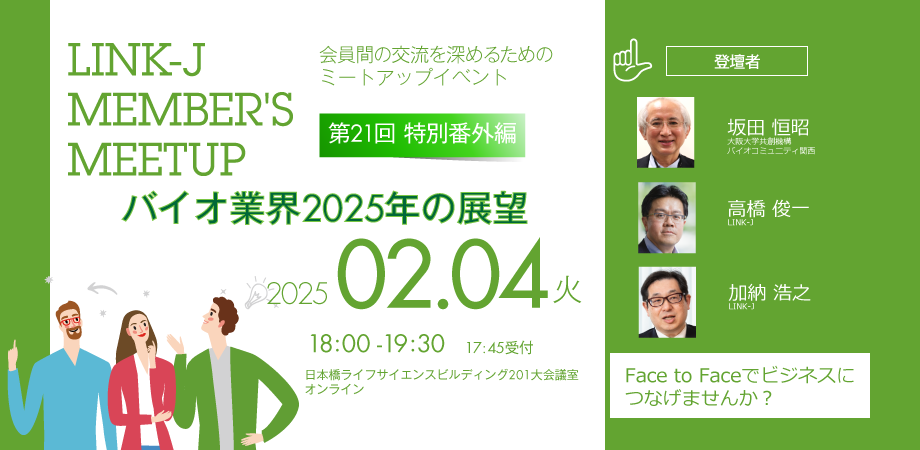 今年の初回は特別番外編として、大阪大学共創機構 特任教授 坂田 恒昭 氏・LINK-J事務局長 高橋 俊一とLINK-J参事 加納浩之にて『バイオ業界2025年の展望』をテーマとして注目のニューモダリティ等の旬の話題について語ります。後半では、LINK-J新規入会員のピッチもございます。リアル会場ではネットワーキングのお時間も設けておりますので、ぜひ参加者同士の交流を深めていただければと思います。