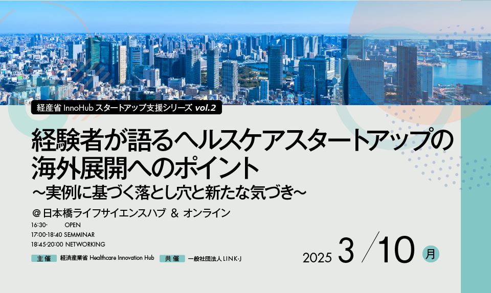 現在、日本では多彩なスタートアップが生まれ、国内外で活躍しています。そんな中、初期段階から海外市場に注目し、海外での事業展開を目指すスタートアップも少なくありません。そこでLINK-Jでは経済産業省Healthcare Innovation Hubと協力し、海外展開を考えるヘルスケアスタートアップ、アカデミアを支援するためにイベントを開催いたします。