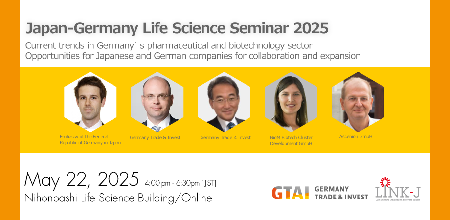 本セミナーでは、LINK-Jとドイツにおけるビジネス展開支援を行うGermany Trade & Invest (GTAI)が協力し、ドイツの医薬品・バイオテクノロジー分野の最新動向をお伝えします。