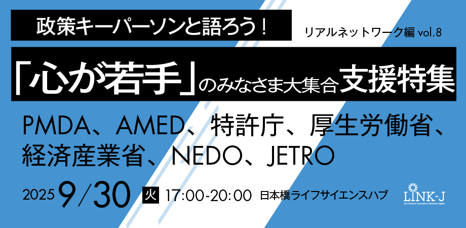 内容 | 政府や自治体の取組・⽀援の現状、課題、⽅向性等につき「官」キーパーソンと本⾳で語る「政策キーパーソンと語ろう!」シリーズは、ライフサイエンス領域に関連が深い複数の政府、独立行政法人、⾃治体等のみなさまと産学のみなさまがリアルの場で情報交換や交流を深めることを⽬的とし、これまで7回開催いたしました。 今回はvol.8としてイノベーション創造支援の最新状況、今後の方向性・展望等をPMDA、AMED、特許庁、厚労省、経産省、NEDO、JETROのみなさまからアップデートいただくとともに、みなさまと交流を深めていただきます。 参加年齢制限はありません。「心が若手」のみなさまにぜひご参加いただき、未来を創る議論と交流を進めていただければ幸いです。 |