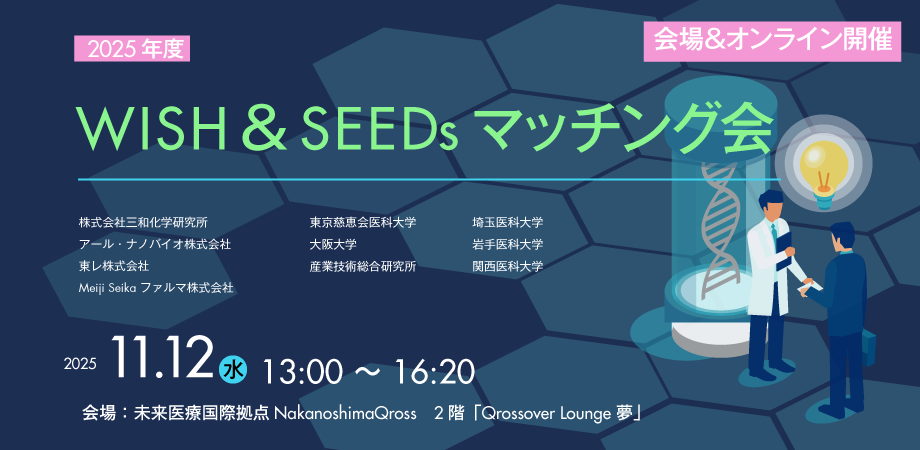 本会は、企業様が現在または将来的に開発を検討されている興味・関心領域(WISH)と、大学等が有するシーズ(SEEDs)を迅速かつ効率的にマッチングさせ、1秒でも早く新しい医薬品や医療機器等を患者様・医療従事者様にお届けしたいという強い思いから実施するものです。