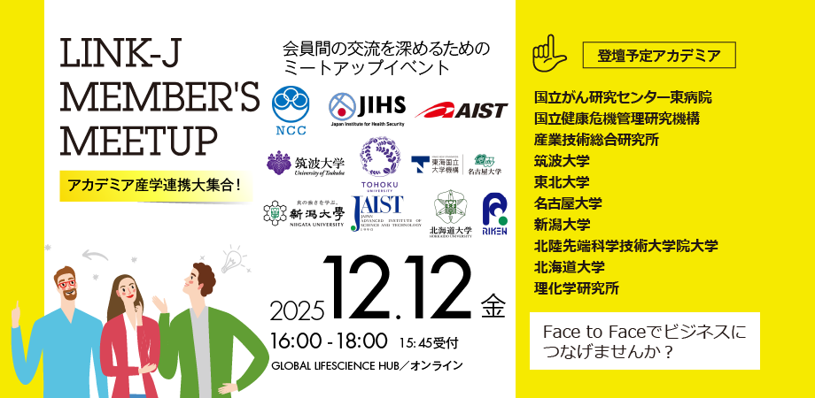 毎回テーマを設けて開催しており、今回は「アカデミア産学連携大集合!」です。大学紹介、産学連携やスタートアップ支援等の取り組みのプレゼンテーション後、リアル会場のみネットワーキングタイムのお時間も設けておりますので、ぜひLINK-J会員同士の交流を深めていただければと思います。
