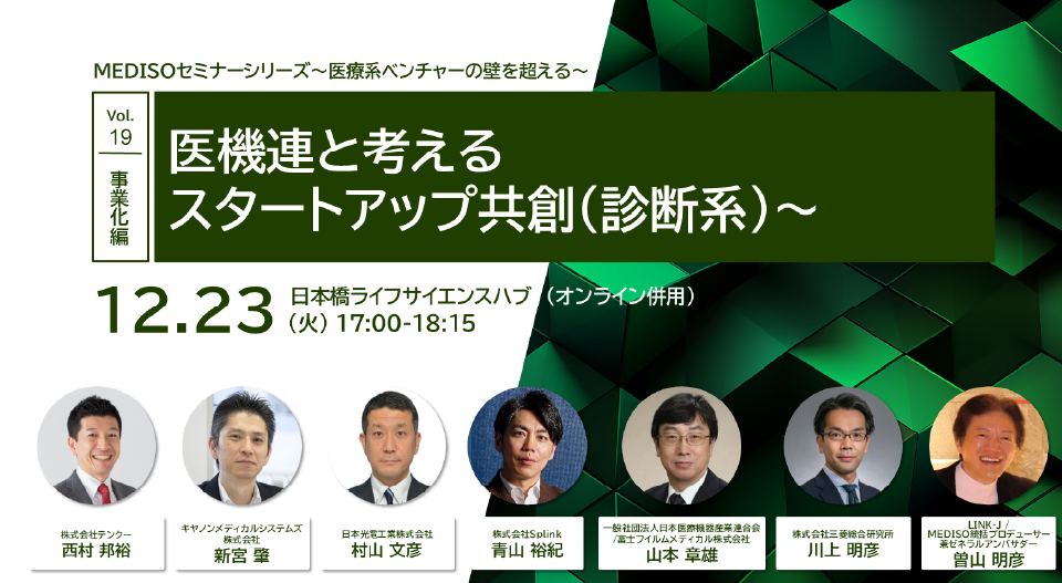 医機連×MEDISOシリーズ第2弾となる今回は「診断系」に焦点を当て、ビジネスモデルや技術革新の特性が治療系とは大きく異なる点を踏まえながら、共創の最前線を探ります。セミナーの前半は、医機連 山本会長(スタートアップ共創推進室室長)、Splink 青山代表(スタートアップ共創推進室副室長)から取り組みの全体像、スタートアップ推進室の委員から各社の取り組みをご紹介します。後半はMEDISO事務局、MEDISO統括プロデューサー兼ゼネラルアンバサダー/LINK-J 曽山も交えたパネルディスカッションを通じて、スタートアップ共創推進の課題や期待、そして今後の展望を徹底的に議論します。
