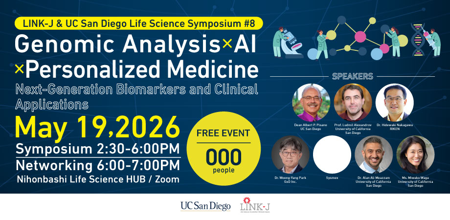 LINK-Jでは、2018年以来、UCサンディエゴと協力して、ライフサイエンスに関連したトピックスを取り上げた特別シンポジウムを日本橋で開催してきました。このシンポジウムでは、アカデミアと産業界のリーダーをお招きしてトピックスの分野における最新動向について議論し、参加者の皆様に最先端の研究とそれらを実用化する意義についてお伝えします。これまで、マイクロバイオーム、システムバイオロジー、精密医療、バイオものづくり、ヘルスケアエンジニアリングなどを取り上げてきましたが、第8回目となる今回は、「ゲノム解析 × AI ×個別化医療」を取り上げます。